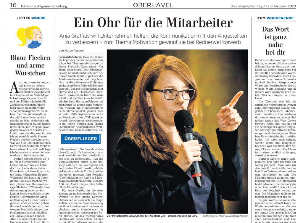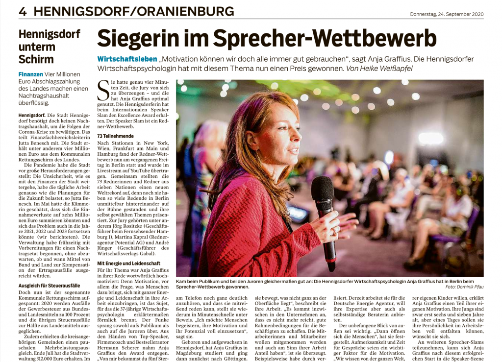 In einem Artikel der MOZ wird über Anja Graffius Teilnahme am rekordträchtigen Sprecher-Wettbewerb mit 73 Teilnehmenden berichtet.